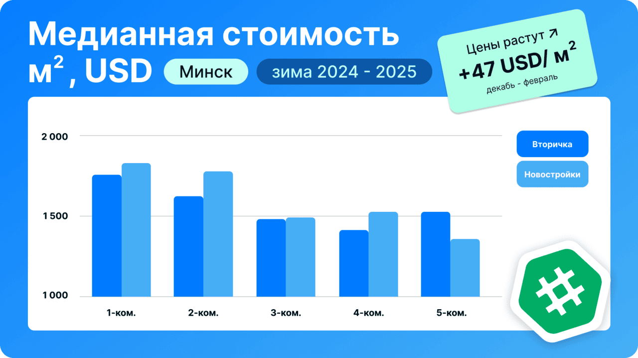 Самыми востребованными традиционно оказались 1-комнатные квартиры – на них пришлось46% всех успешно закрытых сделок за зиму. Их медианная стоимость квадрата в новостройках достигла1 800 USD.