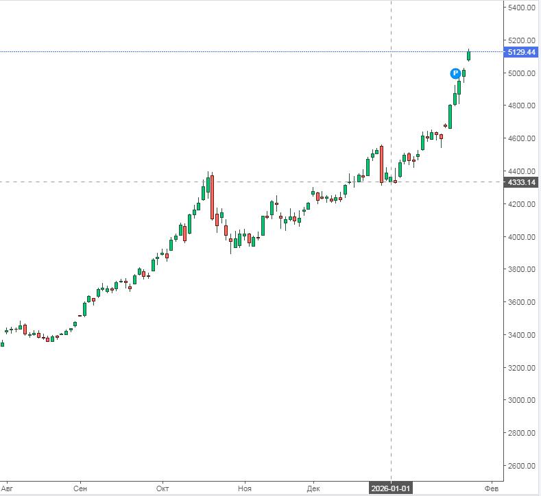 В конце прошлой недели на мировом финансовом рынке произошло событие, которого ожидали по разным оценкам к середине текущего года или ближе к окончанию. Цена унции золота преодолела стратегическую границу в $5000. Причём и фьючерсные контракты, и спотовое золото торговались практически без спреда. В этот же момент цена серебра преодолела важнейший уровень в $100 за унцию, остальные металлы платиновой группы также обновляют исторические максимумы.