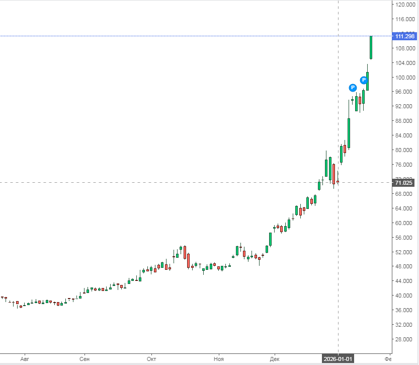 Но ещё более скоростной рост показывает ближайший соратник золота– серебро. За те же три с небольшим недели января серебро дорожает более чем на 55%. А за год с начала 2025 цена серебра растёт более чем в три с половиной раза с примерно $30 за унцию до нынешних $110! Цена унции платины на этом фоне также преодолела отметку в $2900, что является историческим максимумом.