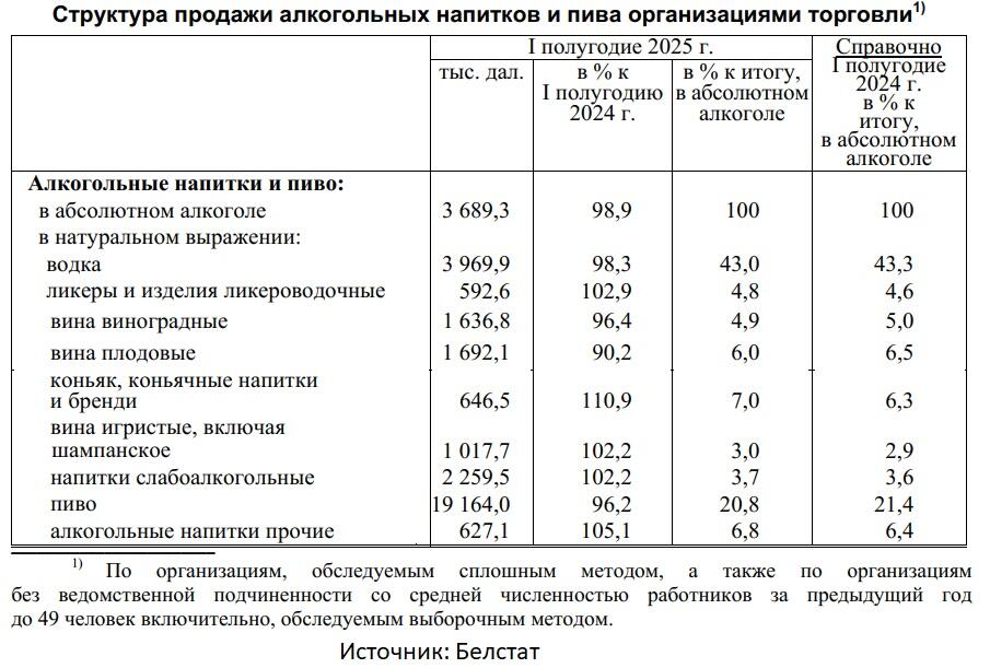 По данным Белстата, в I полугодии 2025 года организациями торговли Беларуси реализовано алкогольных напитков и пива на 3,2 млрд руб., что в розничном товарообороте организаций торговли составило 6,8%.
