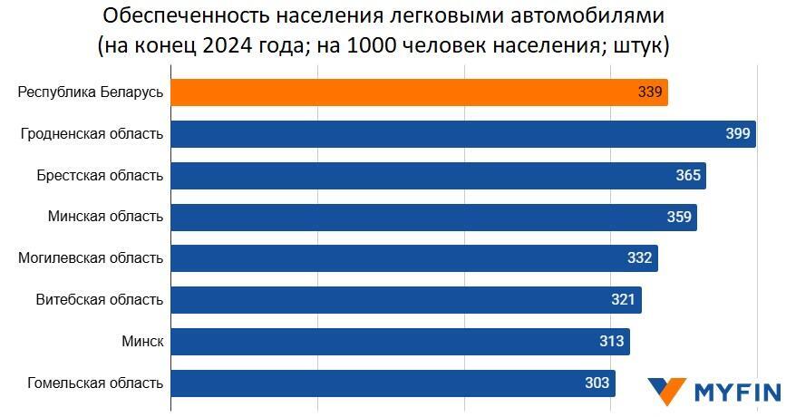 В региональном разрезе лидером была Гродненская область – 399 авто, наименьший показатель отмечен в Гомельской области – 303 машины. В Минске на 1000 жителей приходилось 313 легковушек.