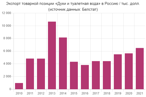 Около трети экспортируемой продукции в 2021 году направилось на российский рынок. Поставки в РФ товарной позиции «Духи и туалетная вода» принесли Беларуси $6,5 млн.