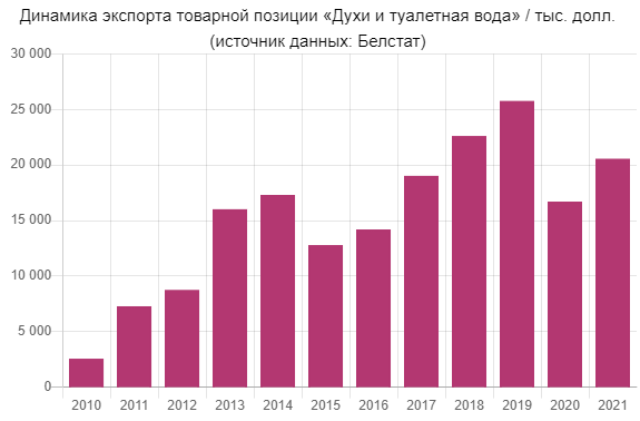 По информации Белстата, в 2021 году на экспорте товарной позиции «Духи и туалетная вода» Республика Беларусь заработала $20,5 млн.