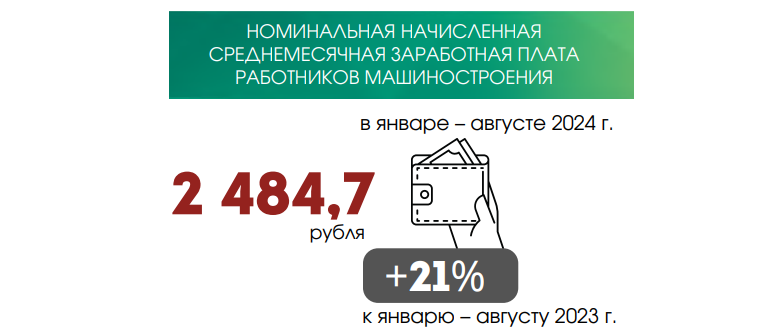 Номинальная начисленная среднемесячная зарплата работников машиностроения в январе – августе 2024 года составила 2484,7 руб.