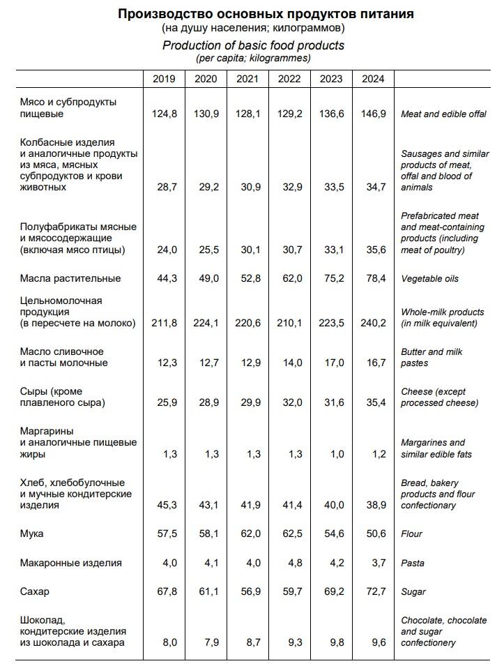 Производство других продуктов питания в 2024 году составило (на душу населения; килограммов):