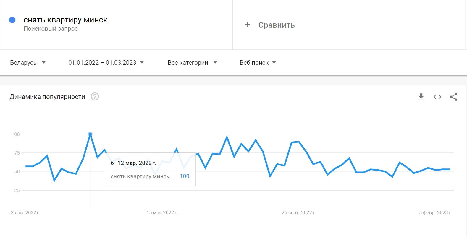 С 6 по 12 марта в Google Trends наблюдается пиковое количество запросов по ключевым словам «снять квартиру в Минске». Это момент, когда арендаторы пытались найти варианты, чтобы переехать в более дешевую квартиру или попросить скидку в соответствии с ситуацией, а арендодатели – сориентироваться в ценах.