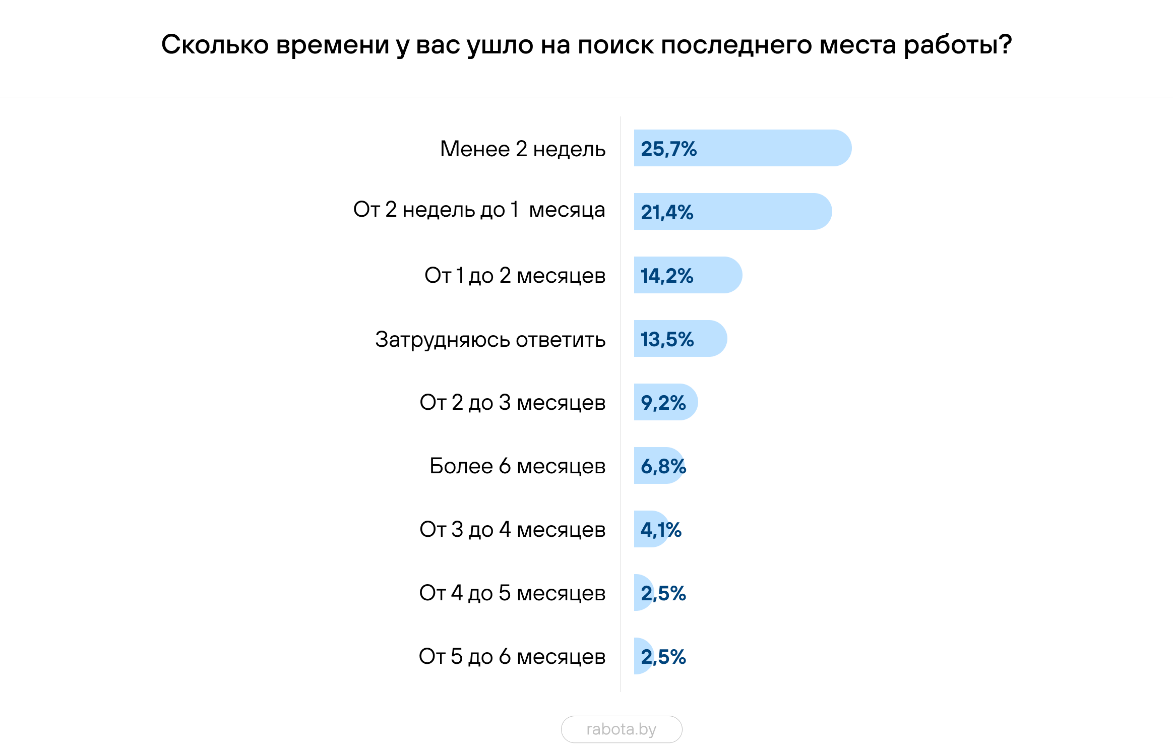 Если говорить о сроках поиска нового места, то у четверти соискателей на поиск последнего места работы ушло менее двух недель. Еще около 21% специалистов сообщили, что выбор занял от двух недель до 1 месяца.