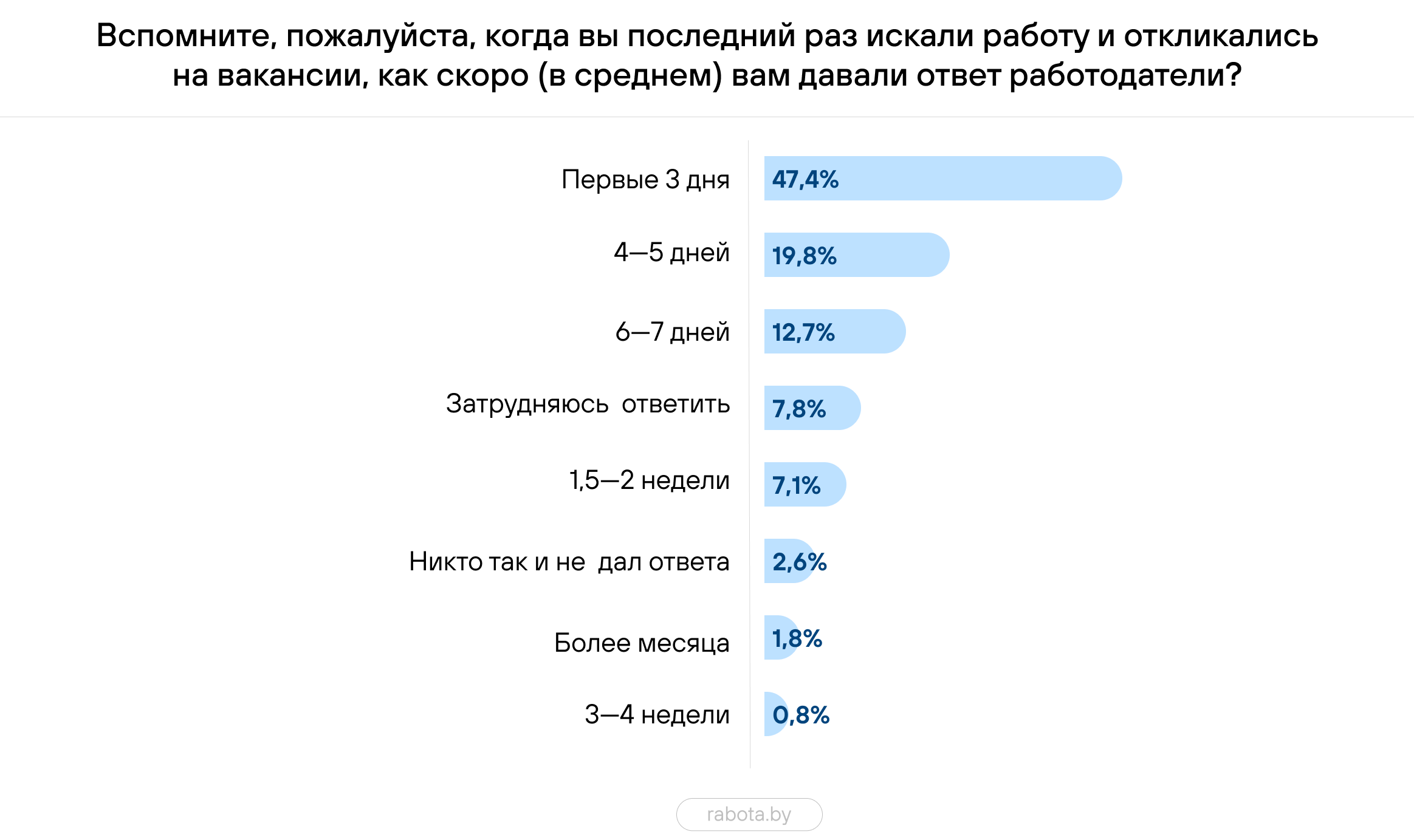 Специалисты сайта rabota.bу провели исследование, чтобы узнать, сколько времени у белорусов уходит на поиск работы и как долго они готовы ждать ответ от нанимателя после отклика на вакансию.