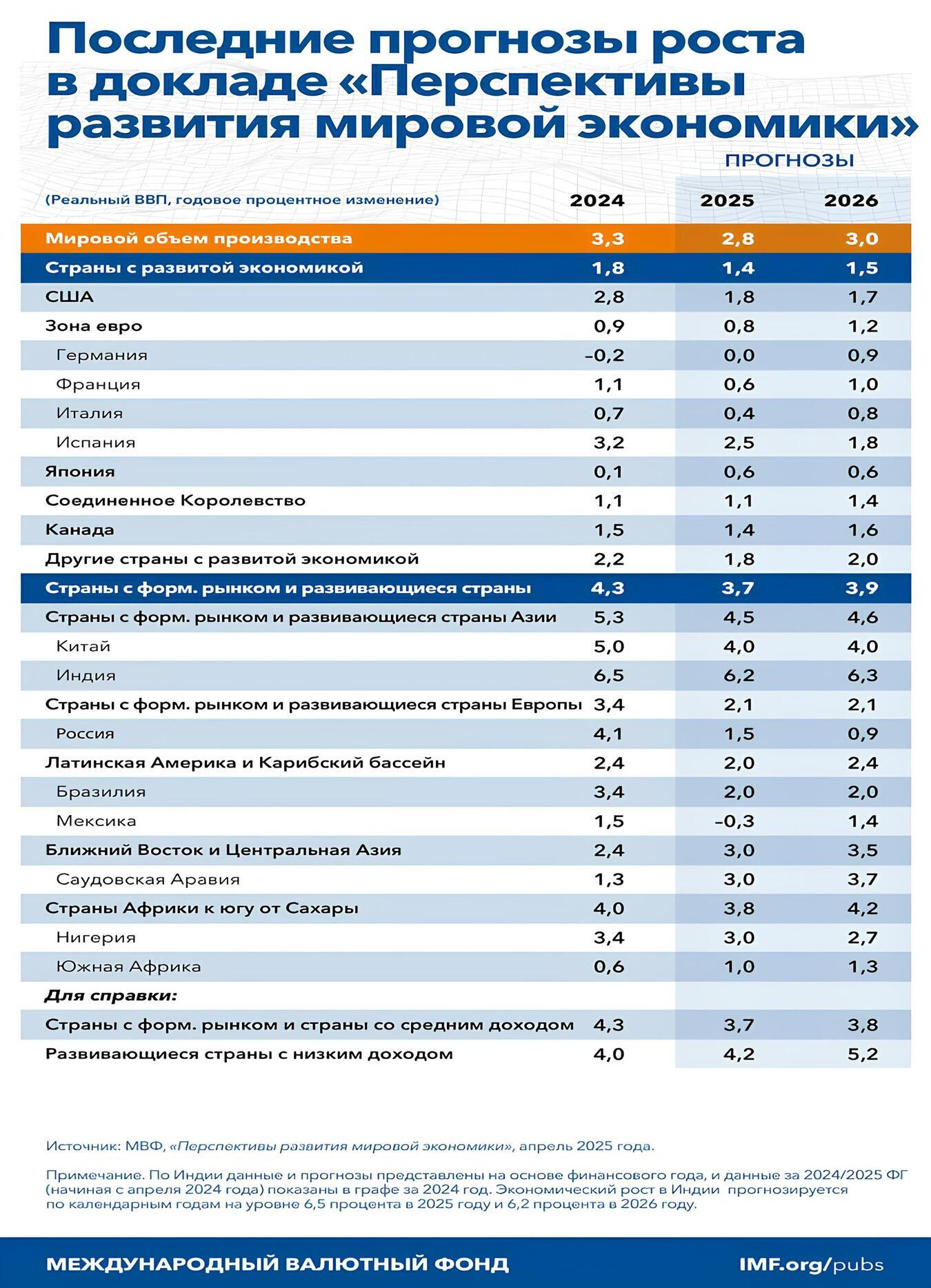 Для стран с формирующимся рынком и развивающихся стран прогноз инфляции снижен на 0,1 п. п. в 2025 году – до 5,5 %, а в 2026-м на столько же повышен – до 4,6 %.