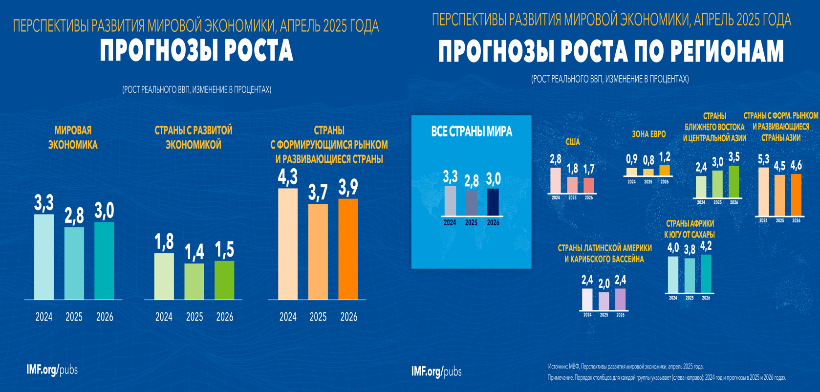 После продолжительной и беспрецедентной серии потрясений мировая экономика, по-видимому, стабилизировалась, с устойчивыми, но не впечатляющими темпами роста, говорится в предисловии к отчету. Однако ландшафт изменился, поскольку правительства по всему миру переупорядочили приоритеты политики, а неопределенность поднялась до новых максимумов. Прогнозы мирового роста были существенно пересмотрены в сторону понижения в апрельском выпускеWorld Economic Outlook по сравнению с январем, отражая рост тарифных ставок до уровней, не наблюдавшихся уже 100 лет, и крайне непредсказуемую обстановку.