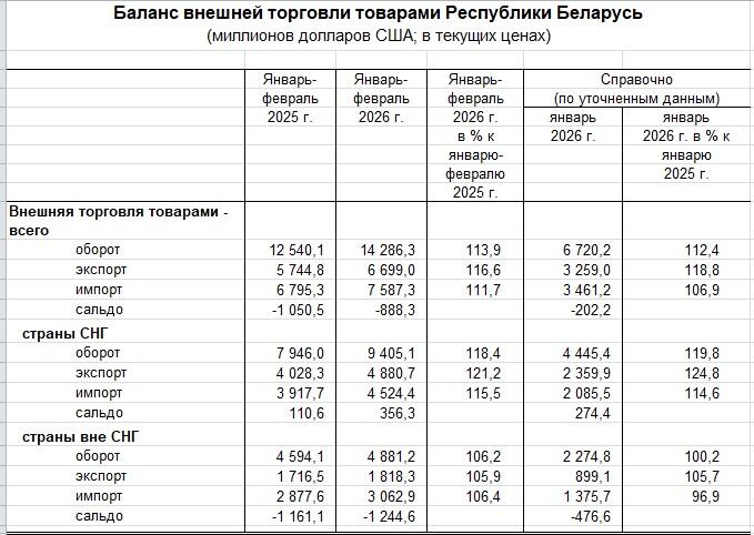 Национальный статистический комитет опубликовал данные по внешней торговле товарами за январь – февраль 2026 года.
