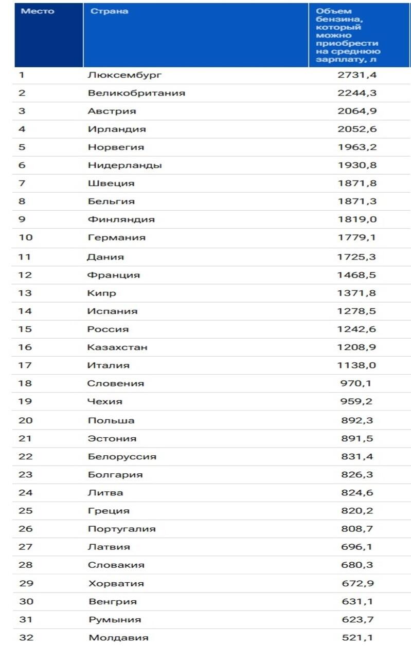 Для оценки доступности топлива учитывался объем бензина, который могут приобрести на свои среднемесячные зарплаты жители разных государств.