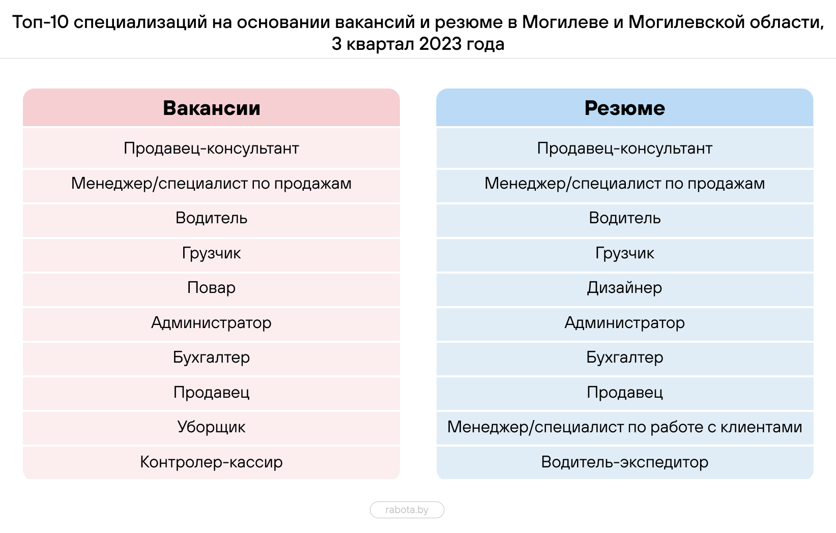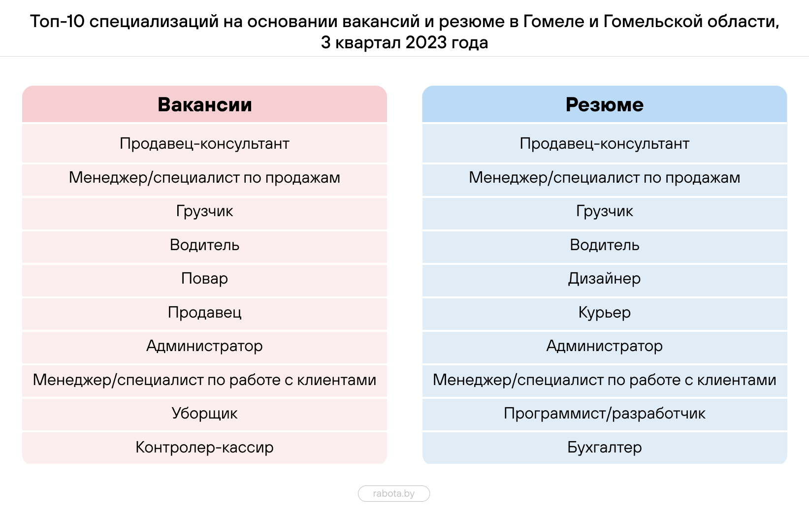 В Гомельской области в список из 10 наиболее популярных вакансий попали повара, продавцы, уборщики, контролеры-кассиры, в то время как в резюме их заменили дизайнеры, курьеры, программисты и разработчики, а также бухгалтеры.