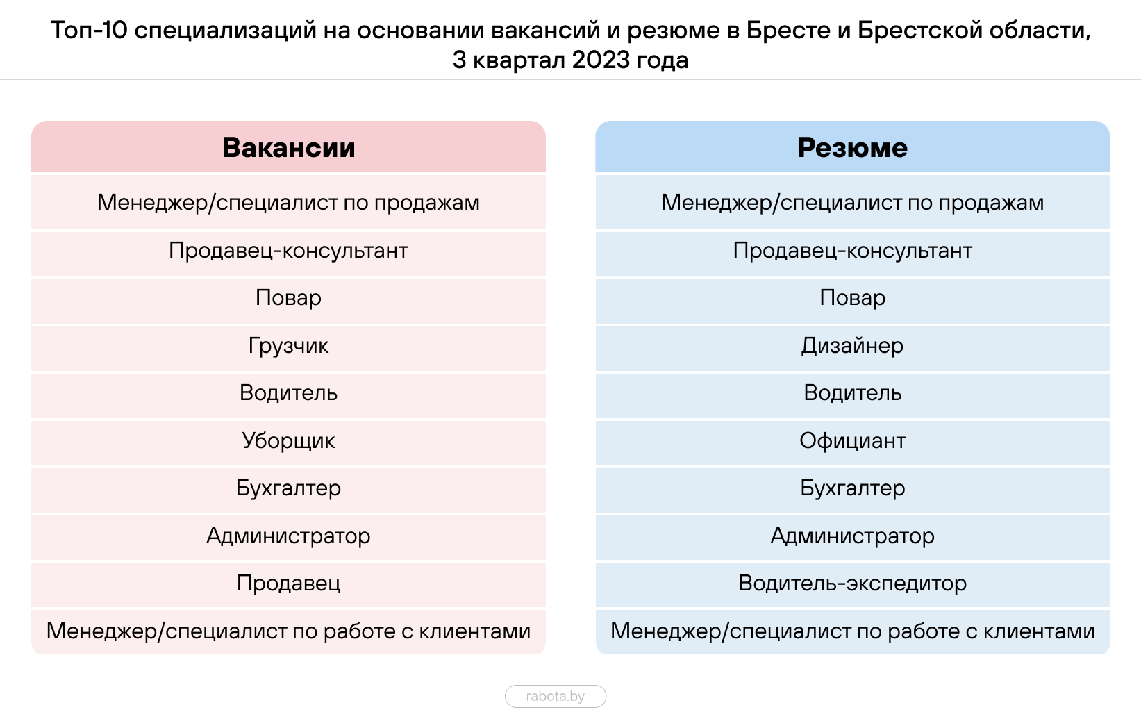 В Брестской области по вакансиям в топ-10 вошли грузчики, уборщики, продавцы, а в числе резюме вместо них разместились дизайнеры, официанты и водители-экспедиторы.