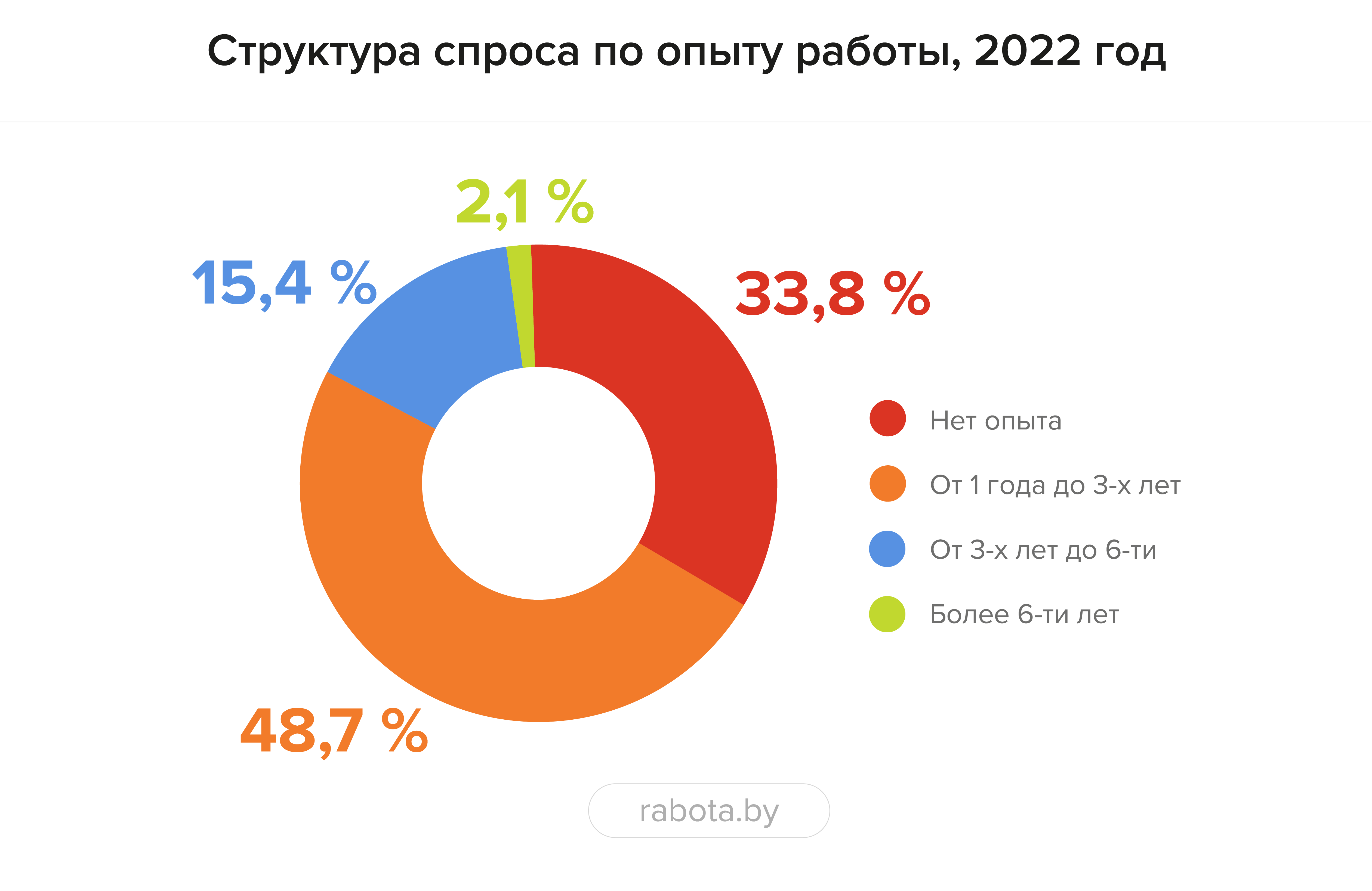 Как и в прошлом году, около половины работодателей ориентированы на поиск специалистов с опытом от 1 года до 3 лет (48,7%). Специалисты, не имеющие опыта работы, также достаточно востребованы: для них размещено 33,8% вакансий от общего количества на сайте.