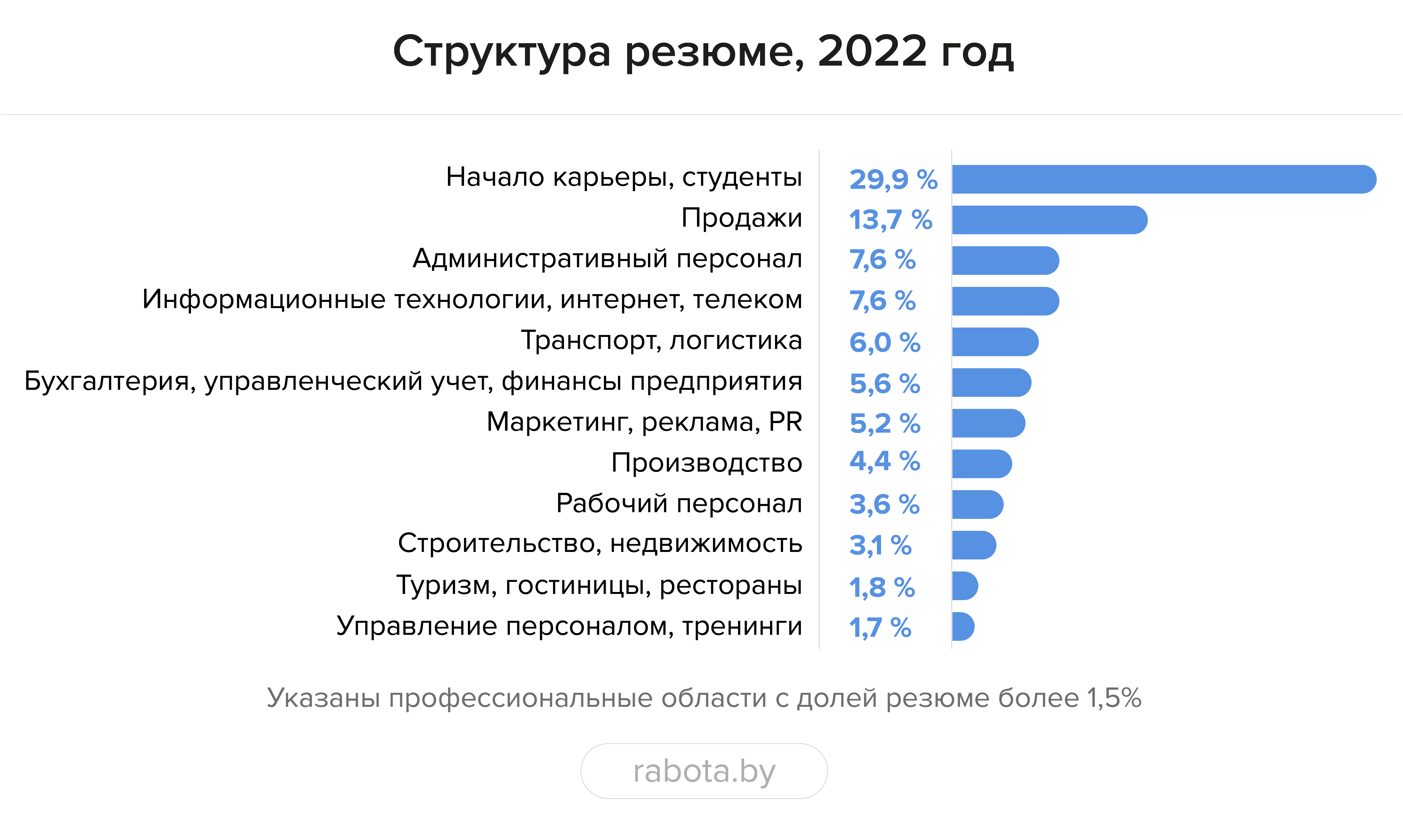 По итогам 2022 года наибольшее увеличение количества резюме в сравнении с 2021 годом произошло в следующих профессиональных областях: