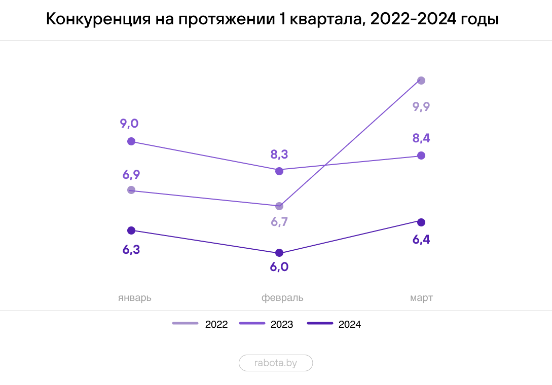 Средняя конкуренция по итогам января – марта составила порядка 6,3 резюме на одну вакансию. Если проводить сравнение с ушедшим годом, то конкуренция снизилась: в 2023 году по итогам первого квартала она находилась на уровне около 8,6 резюме на одну вакансию.