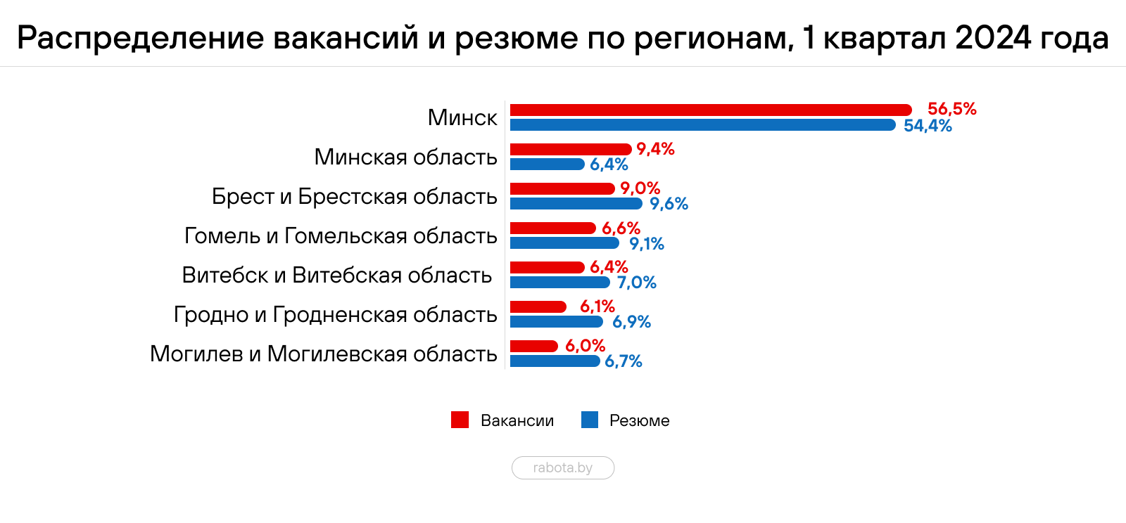 Как и в предыдущие годы, наибольшее количество вакансий и резюме размещено в белорусской столице, а также в Бресте и Брестской области.