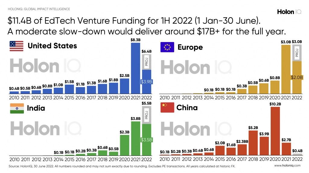 Платформа бизнес-анализа HolonIQ представила обзор финансирования проектов в области образовательных технологий (так называемый EdTech) за первое полугодие 2022 года.