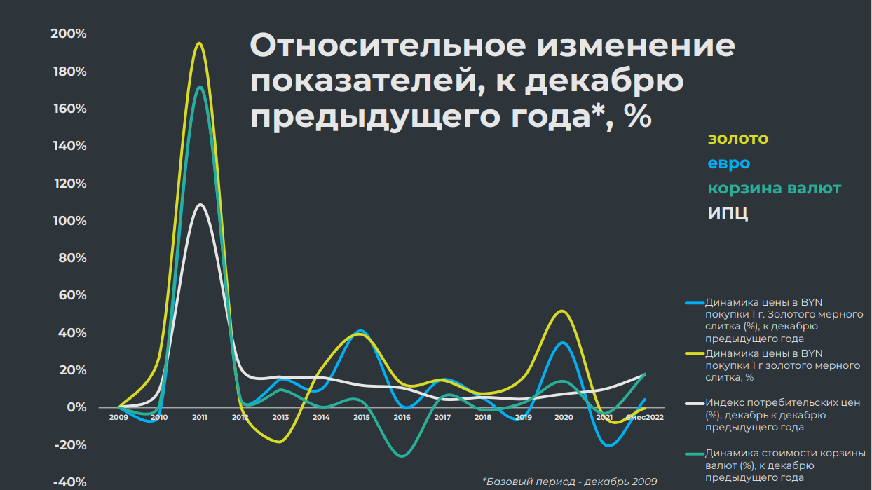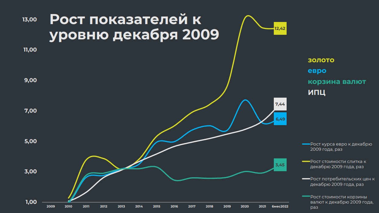– Если смотреть внимательней на каждый год, то видны существенные отличия. А если взять 10-летний горизонт, то ситуация с нарастающим итогом выглядит уже не так «похоже». В итоге на 10-летнем контракте разница колоссальная. И привязавшись в 2009 году к золоту арендодателю можно было бы получить в два раза больше, а арендатору, внеся в договор корзину валют, – заплатить почти в 2 раза меньше. За эти годы разница между инфляцией и евро примерно 100%, – почти 10% в год, – привел цифры Четвериков.