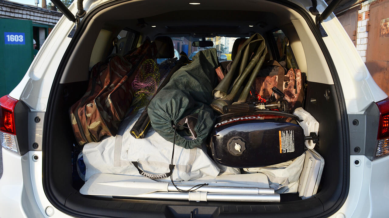 После этого в багажник отправились лодка, весла, двигатель, сиденья к лодке; спининги, подсак и пенал с рыболовными снастями; сумки с амуницией и резиновые сапоги, а также ряд других необходимых мелочей, которые, как оказалось, также занимают много места.