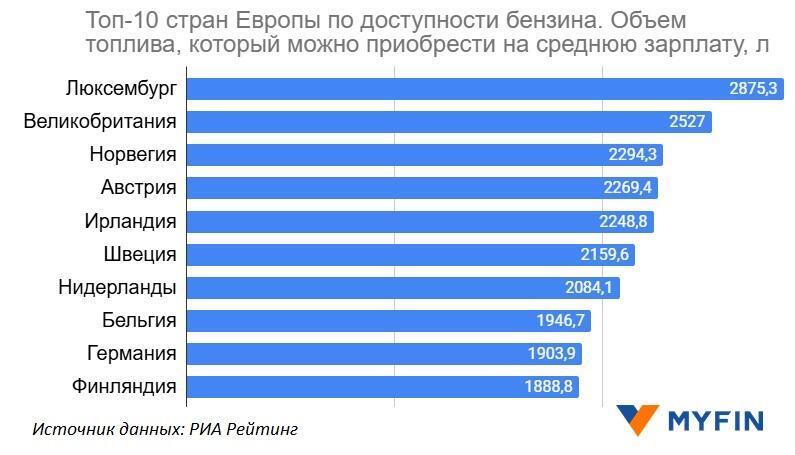 Для оценки доступности автомобильного топлива учитывался объем бензина, который могут приобрести на свои среднемесячные зарплаты жители стран Европы.