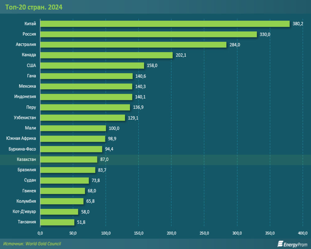 По итогам 2024 года в мире было произведено около 3,7 тыс. тонн золота – на 0,6% больше, чем годом ранее. Лидером выступает Китай, на который пришлось 10,4%, или 380,2 тонны.