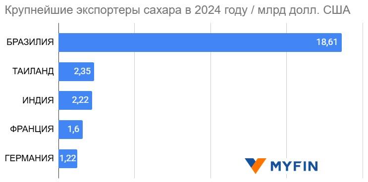 По данным UN Comtrade, в 2024 году Бразилия заработала на экспорте сахара около $18,61 млрд. Помимо Бразилии, в тройку ключевых экспортеров сахара входят Таиланд и Индия, однако объемы поставок из этих стран в разы меньше, чем у южноамериканского государства.