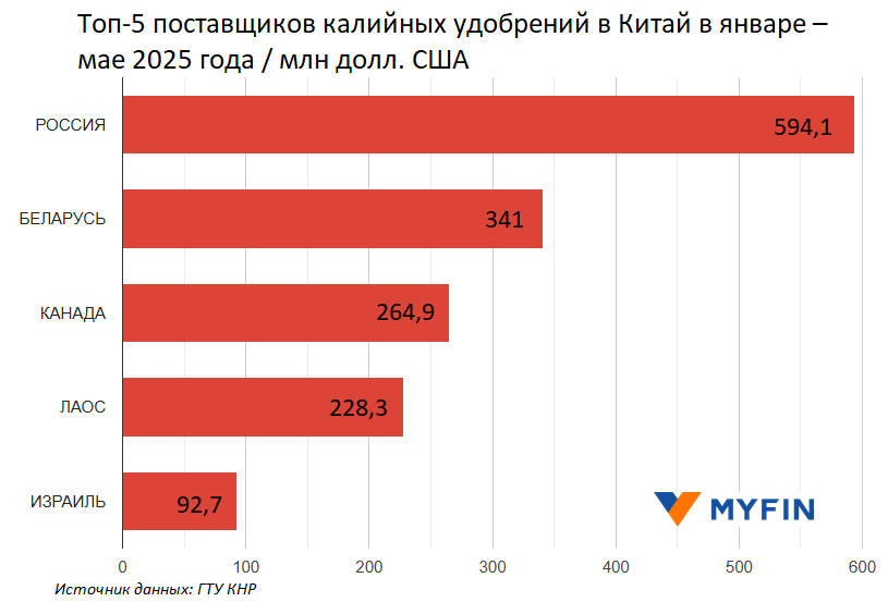 Россиялидирует по поставкам калия на китайский рынок – ввоз обошелся азиатскому государству в $594,1 млн по итогам января – мая 2025 года.