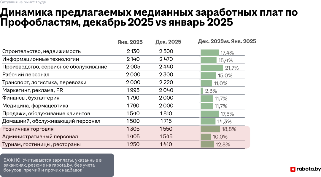 При этом в розничной торговле, а также в профессиональных сферах «Туризм, гостиницы, рестораны» и «Административный персонал» несмотря на положительную динамику относительно января 2025 года медианные предлагаемые заработные платы остаются ниже, чем в большинстве профобластей.