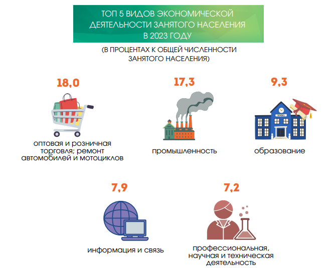 Также ведомство назвало топ-5 видов экономической деятельности занятого населения Минска в 2023 году. В список вошли: