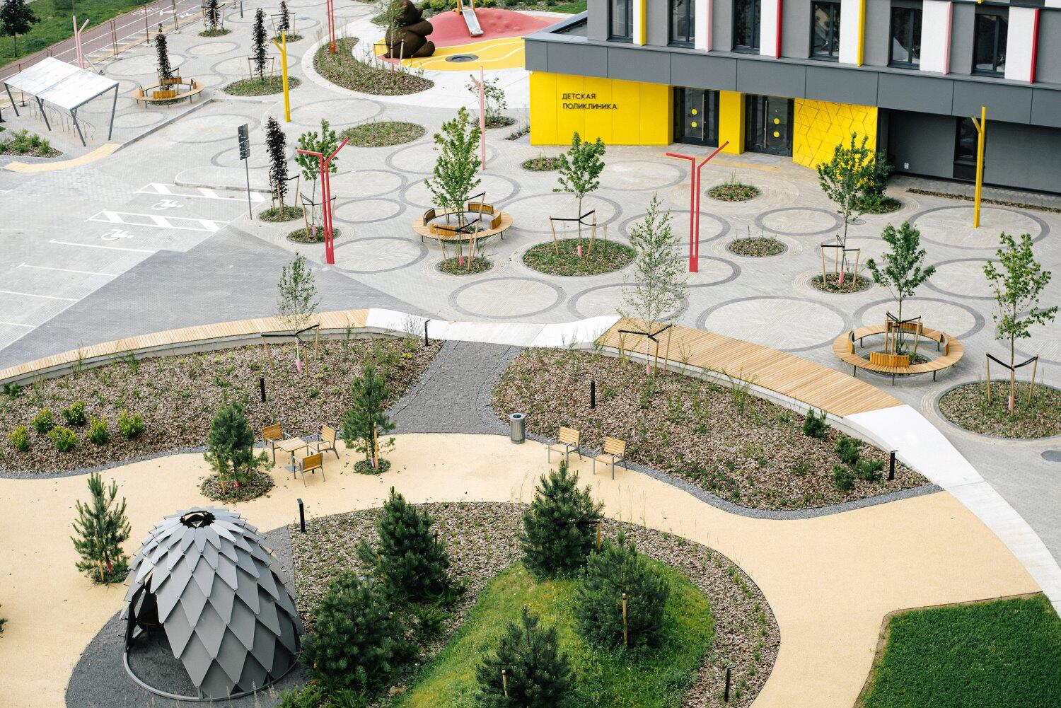 Перед поликлиникой создана рекреационная зона. Площадка перед корпусами обеспечивает безопасное и удобное распределение потоков посетителей.