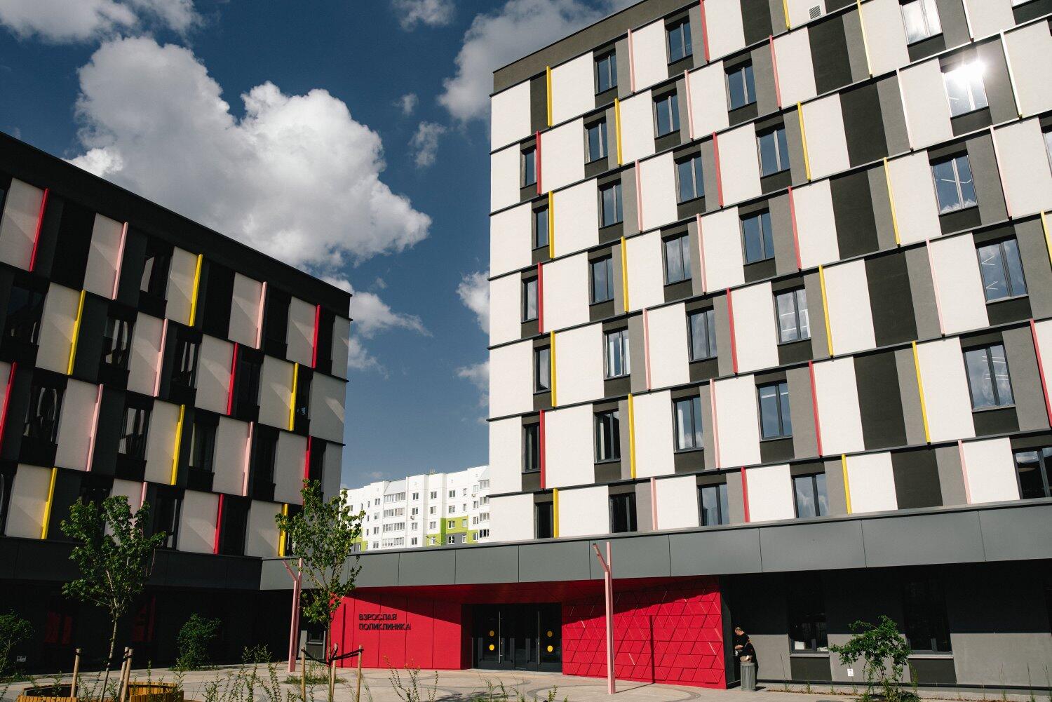 Поликлиника представляет собой современный медицинский комплекс из двух корпусов: семиэтажного (для взрослых) и четырехэтажного (для детей). Они соединены стилобатом, который позволяет врачам перемещаться между зданиями, не выходя на улицу.