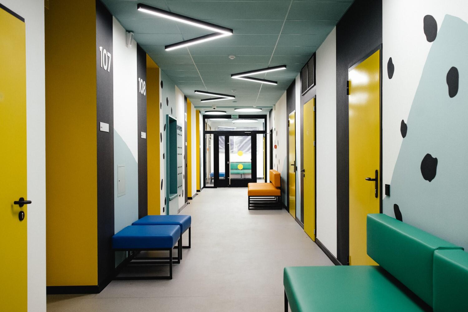 Как пояснили в компании, в детском корпусе всё подчинено идее игры и легкости: веселые узоры, будто срисованные с детских рисунков, мягкие формы, интерактивные элементы – все это призвано отвлечь малышей от тревоги и превратить визит к врачу в маленькое приключение. Во взрослом корпусе узоры в коридорах более строгие и графичные.