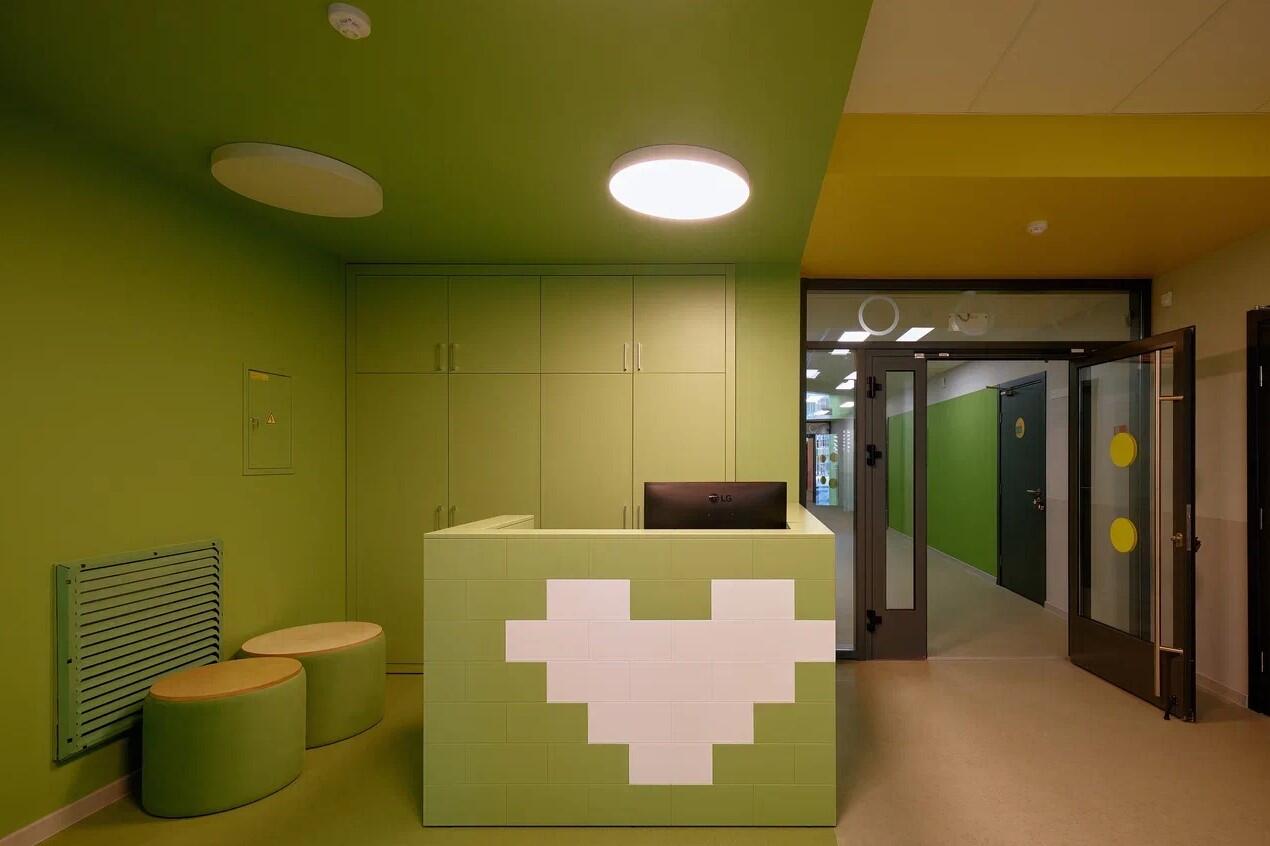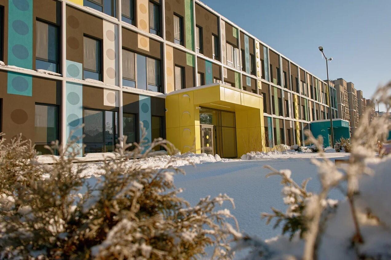 Садик называется «Кубики». Визуально здание напоминает гигантскую коробку конструктора, а входные группы выполнены как огромные, готовые к сборке детали Лего.