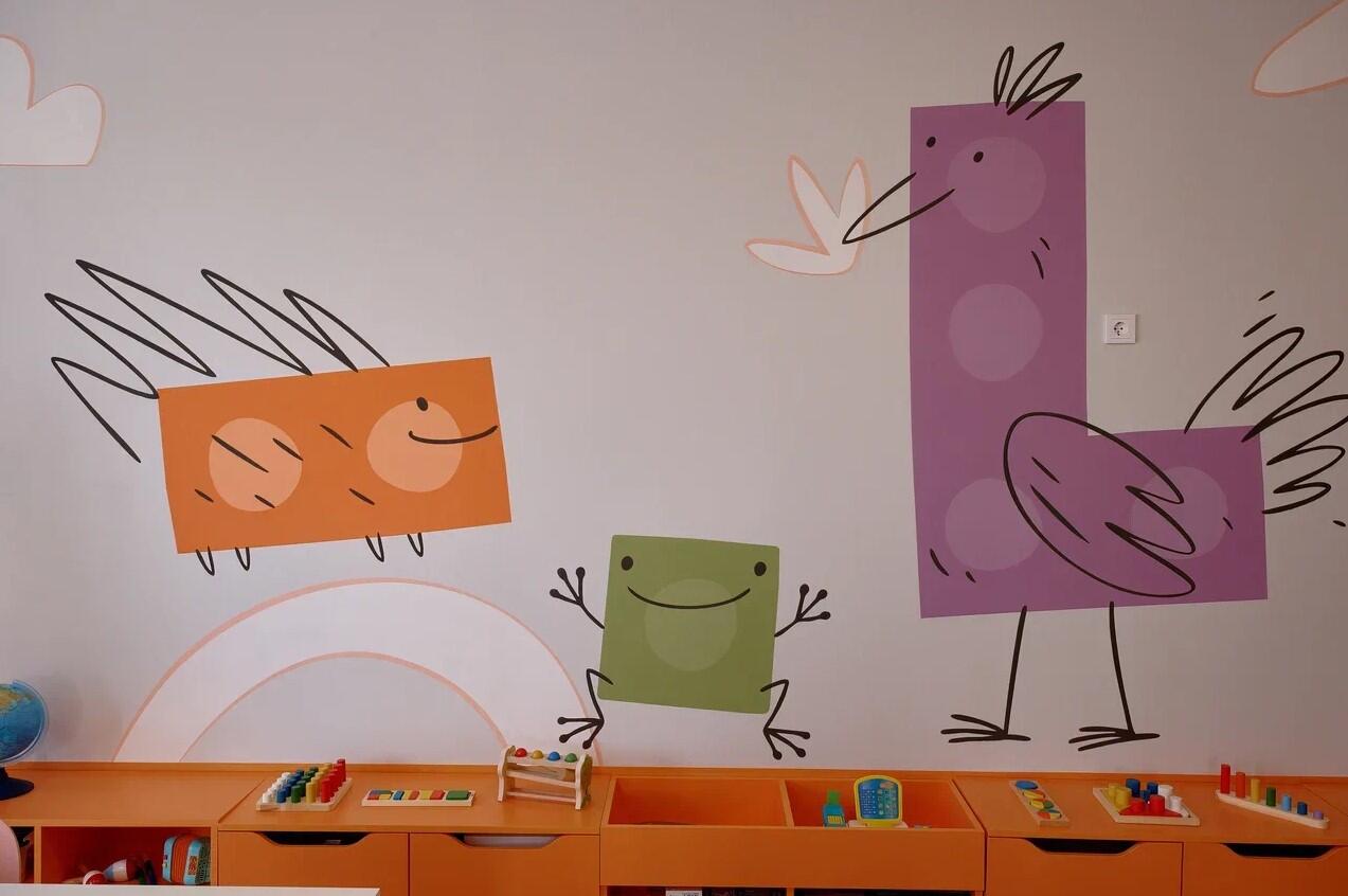 Интерьеры выдержаны в единой стилистике, они оформлены в тематике природных зон: лес, тропики, море, пустыня. В каждой группе нарисованы зверята, как будто собранные из кубиков.