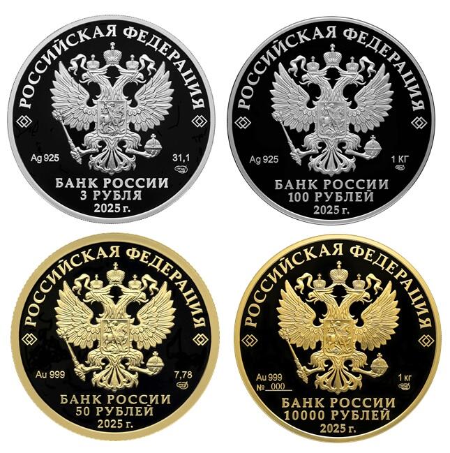 Монеты номиналом 3 руб. и 100 руб. – серебряные, а 50 руб. и 10 тыс. руб. – золотые.