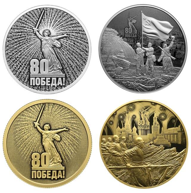 На другой стороне трехрублевой монеты изображен логотип празднования 80-летия Победы – памятник «Родина-мать зовет!». На серебряной монете номиналом 100 руб. изображены советские воины, водружающие флаг над Рейхстагом.