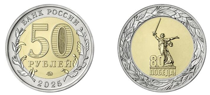 Пятидесятирублевая монета из недрагоценных металлов содержит рельефное изображение логотипа празднования 80-летия Победы в ВОВ. На кольце вдоль канта – рельефное изображение лаврового венка.