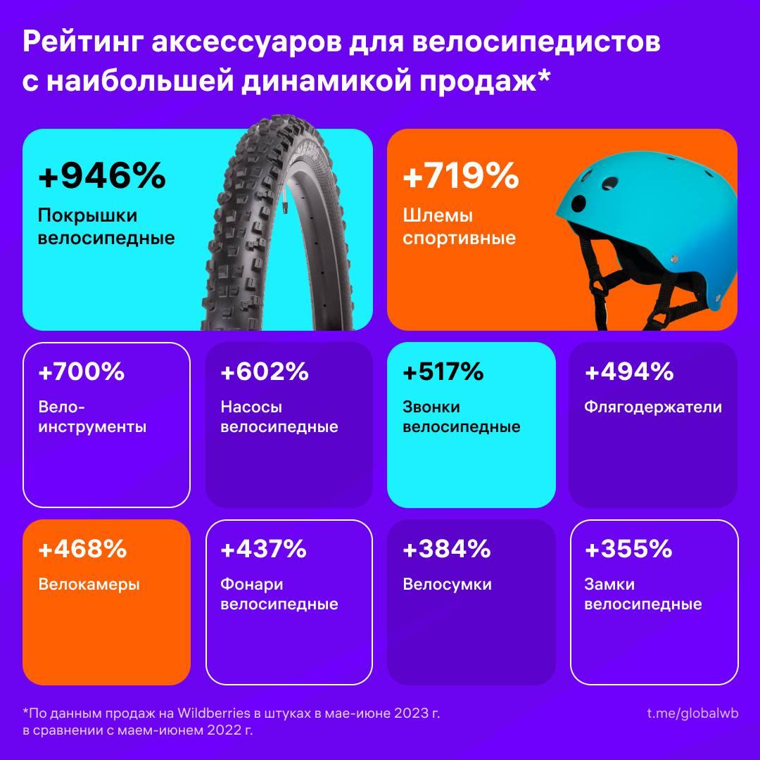 Велоинструменты (+700%), насосы (+602%), звонки (+517%), флягодержатели (+494%), велокамеры (+468%), фонари (+437%), велосумки (+384%) и замки (+355%) тоже показали существенный рост продаж.