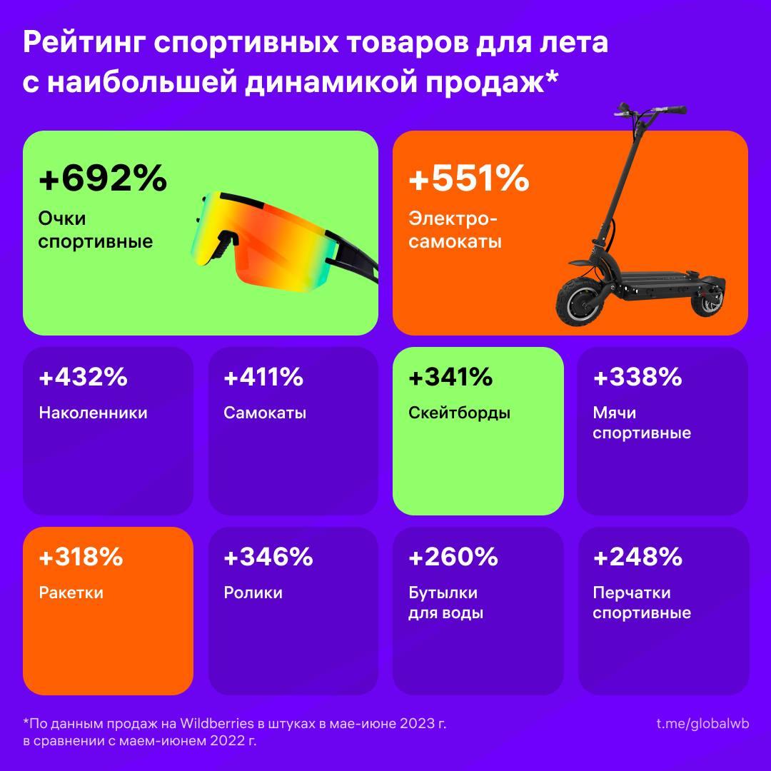 Как сообщили в Wildberries, в Беларуси прошлом мае-июне по сравнению с аналогичным периодом предыдущего года среди спортивных товаров для лета наибольшую динамику продаж продемонстрировали спортивные очки (+692%) и электросамокаты (+551%).
