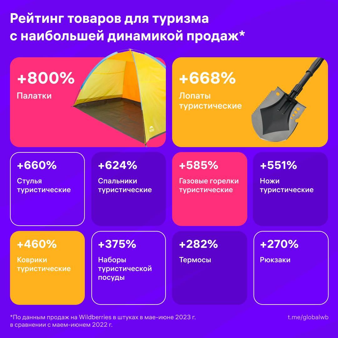 Среди товаров для туризма по росту продаж лидировали палатки (+800%) и специальные туристические лопаты (+668%).