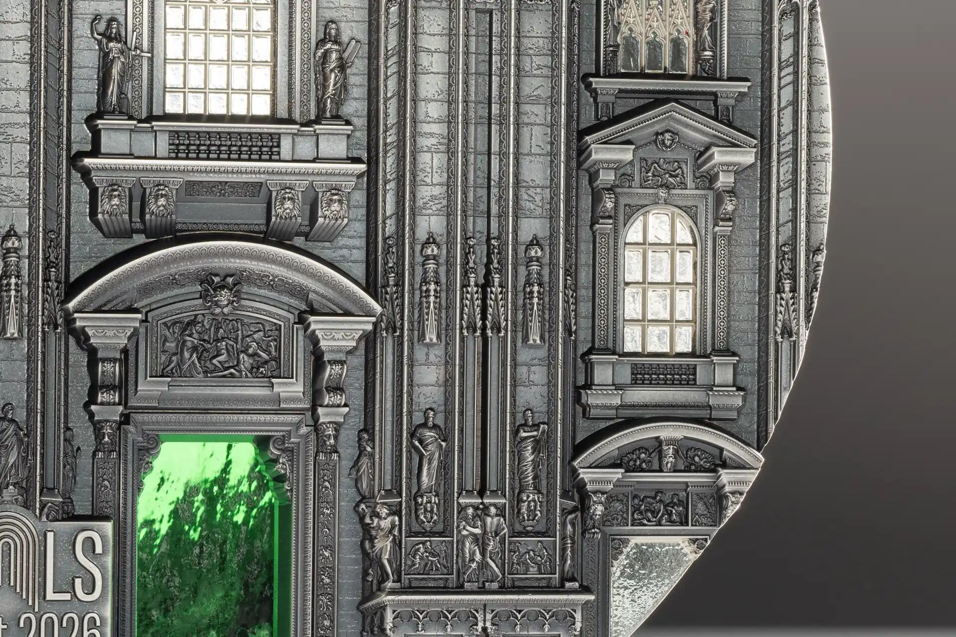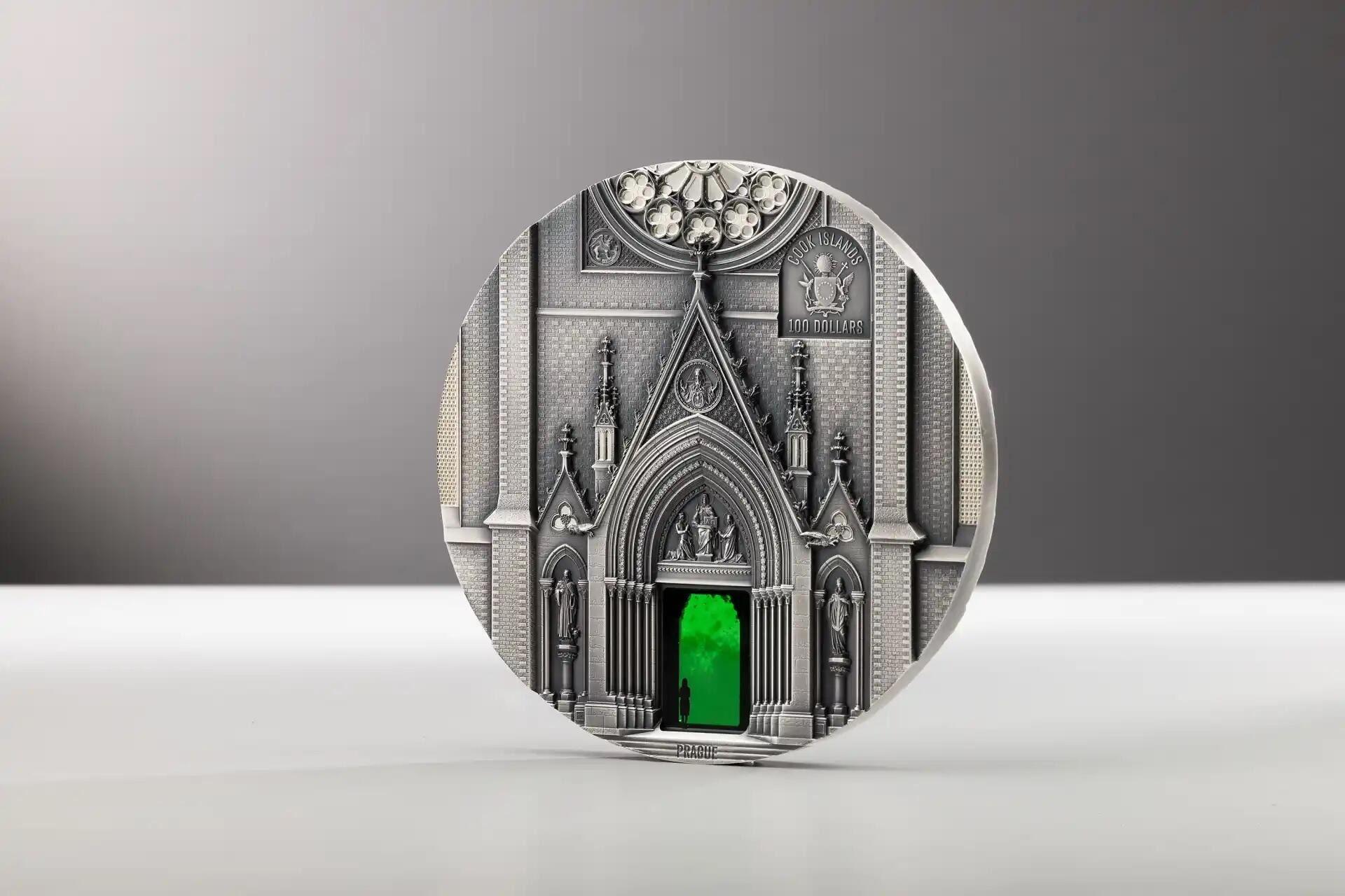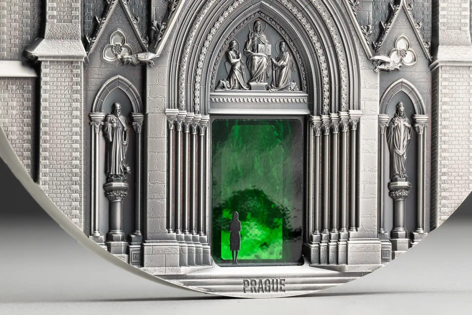 На реверсе изображен главный фасад Миланского собора, а на аверсе – вход в храм Святой Людмилы в Праге.