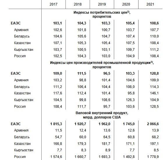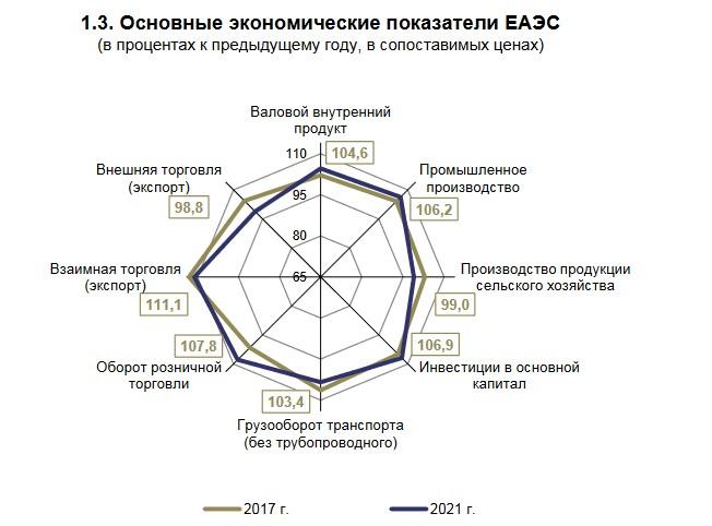 Валовой внутренний продукт стран ЕАЭС в 2021 году достиг 2 066,6 млрд долларов США и увеличился на 7,3% по сравнению с 2017 годом.