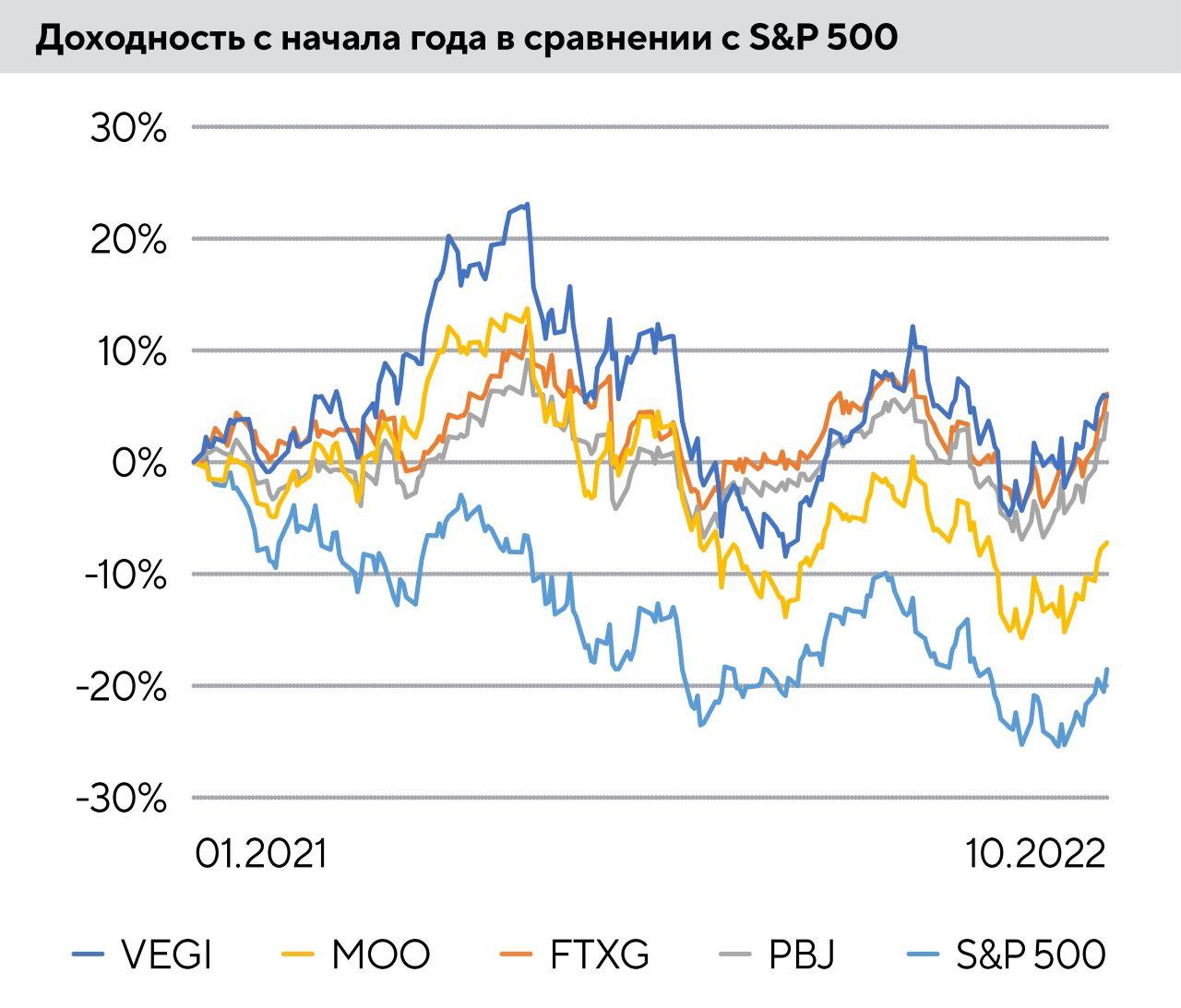 Хотя с начала года американские фондовые площадки находились во власти коррекции, оба актива демонстрировали позитивную динамику: +3,7% у FTXG, +2,1% у PBJ. (Данные приведены по состоянию на сентябрь-октябрь 2022 года.)