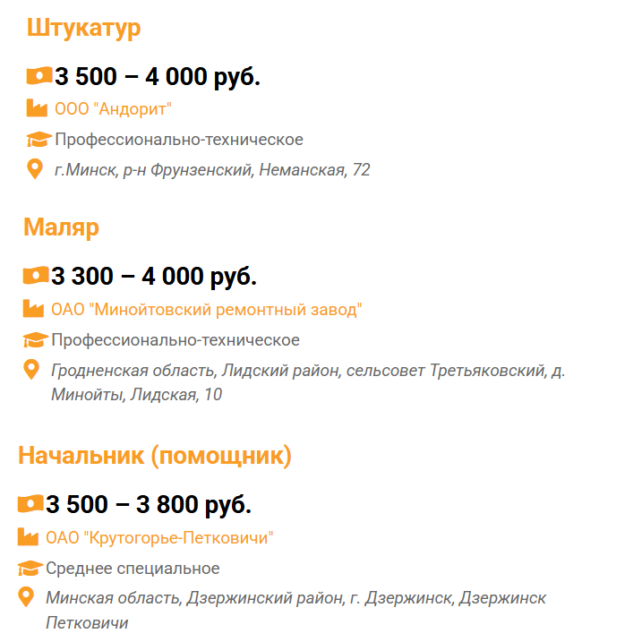 Зарплатное предложение для монтажника фасадных систем (ООО «МСК-ВентИнжиниринг») составляет около 4000 руб., машиниста дизель-поезда (локомотивное депо Лида) – 3600–3900 руб.