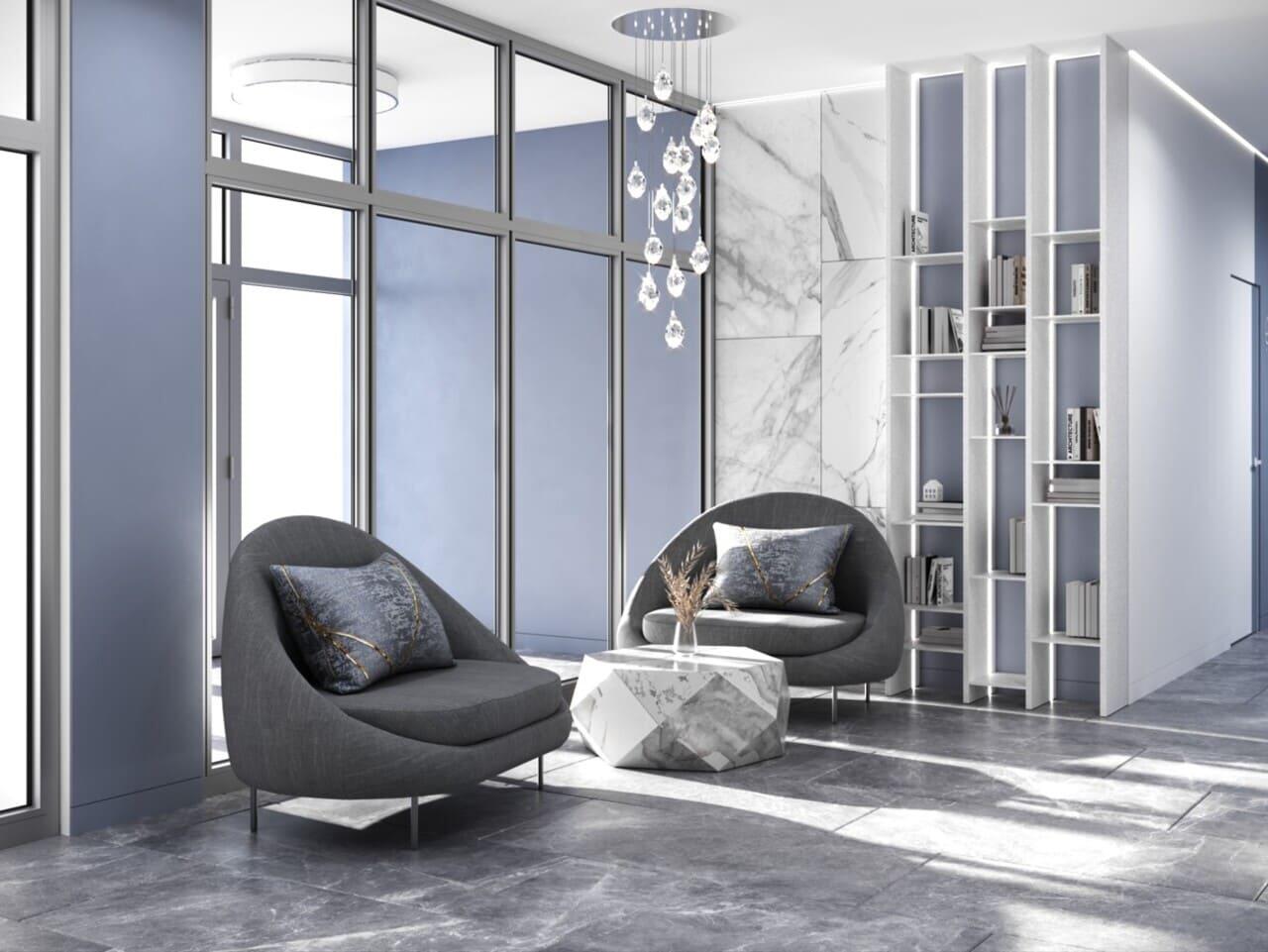 - Стильные зоны ожидания: удобные кресла, журнальные столики, полки для буккроссинга.