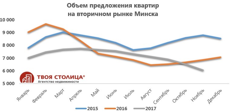 В 2017 году спокойным месяцем можно назвать только январь: тогда в Минске было продано даже менее 700 квартир. Но уже в феврале этот показатель поднялся до 900 квартир, а в марте перевалил за отметку в 1 250 проданных квартир. В целом же в течение 2017 года, среднее количество совершаемых сделок находилось на уровне 1 100 проданных квартир в месяц, из которых порядка 10% занимали новостройки.
