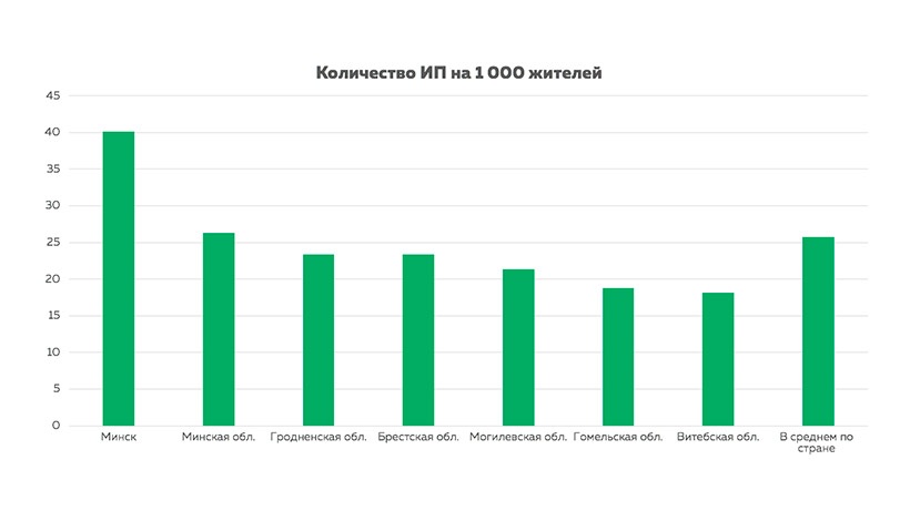 Минская область лидирует по общему числу ИП и их доле среди населения. В самом предприимчивом регионе даже без учета столицы насчитывается 26 индивидуальных предпринимателей на 1 тыс. жителей. Больше только в Минске – около 40 ИП на каждую тысячу горожан.