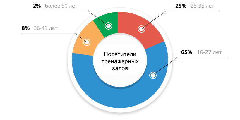 Основной возраст людей, которые интересуются спортзалами – с 16 до 27 лет. Таких посетителей в залах около 65%, 28-35 лет – 25%, а вот люди возраста 40 и более лет – около 8%, из категории «50 плюс» – считанные единицы. Почему так происходит, трудно сказать.